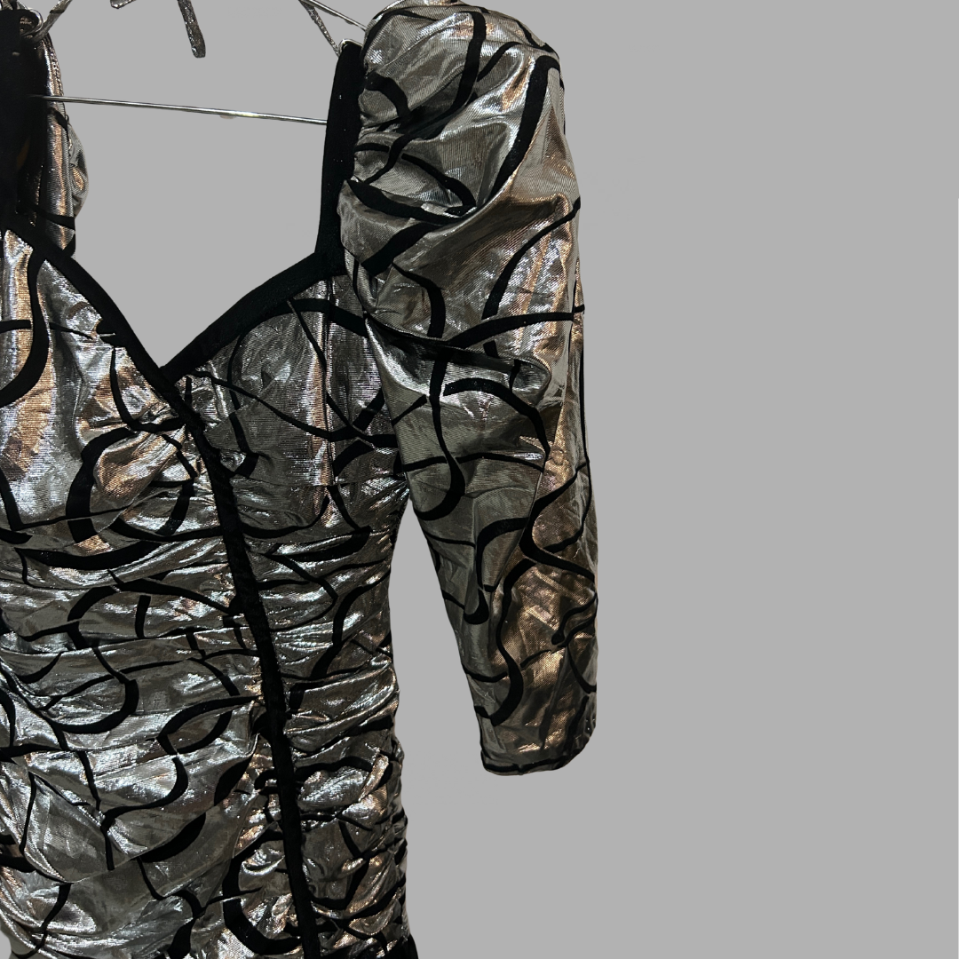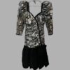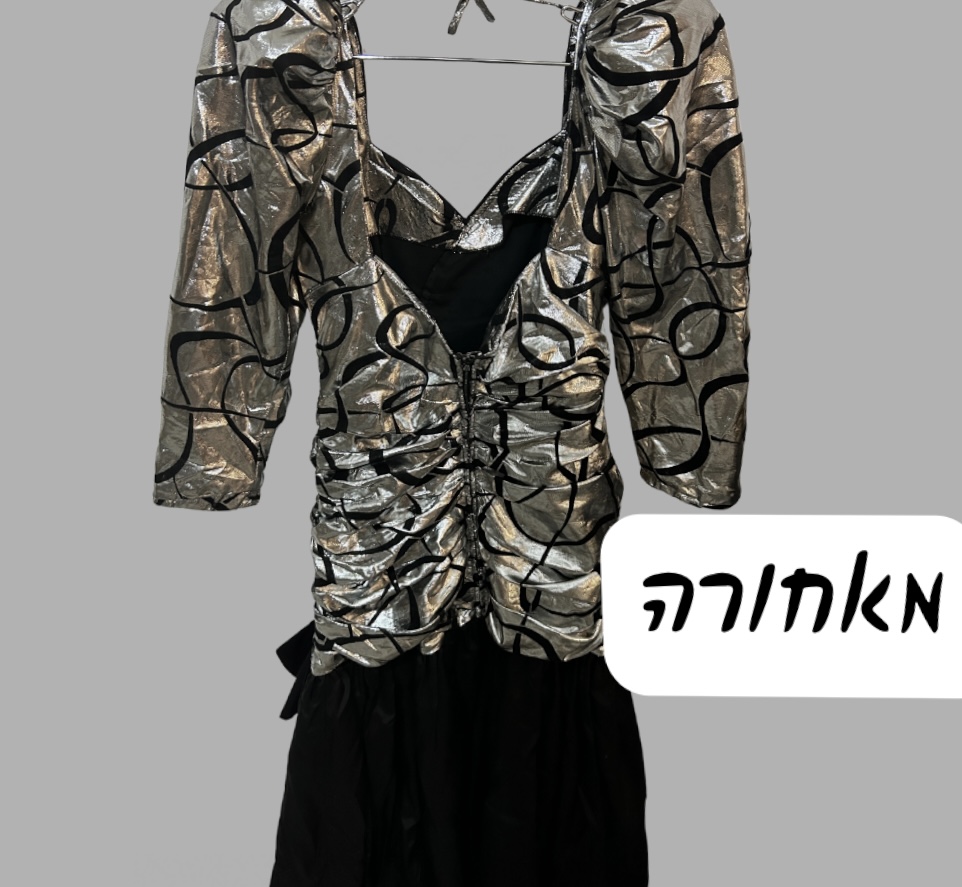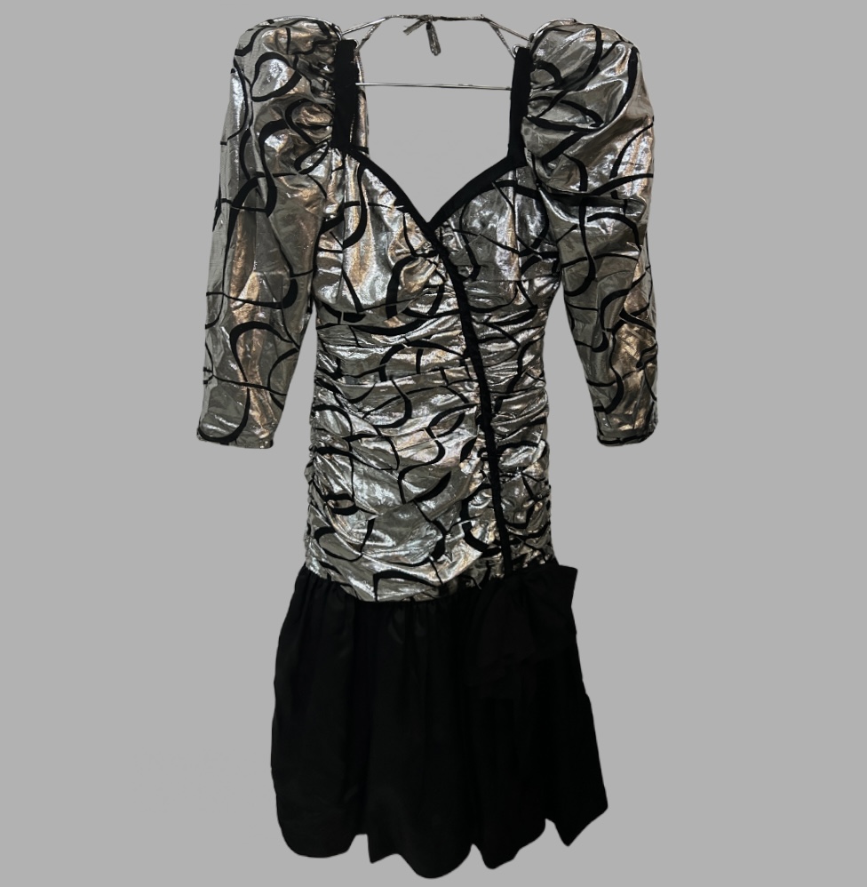 שמלת הווינטג׳ הזו מהאייטיז היא לא עוד שמלה – היא הצהרה. שמלת ערב וינטג׳ בסגנון אייקוני שמחזירה אותנו לתקופה שבה כל הופעה הייתה חגיגה של סטייל, דרמה ונוכחות. השמלה עשויה בד כסוף מבריק עם שילובי שחור דקורטיביים, במראה מבריק ויוקרתי שכובש כל חדר. עם כריות כתפיים מודגשות ושרוולים תפוחים – זו בדיוק אותה שמלת שנות ה־80 הנדירה שכל חובבת וינטג׳ אמיתית חולמת עליה.