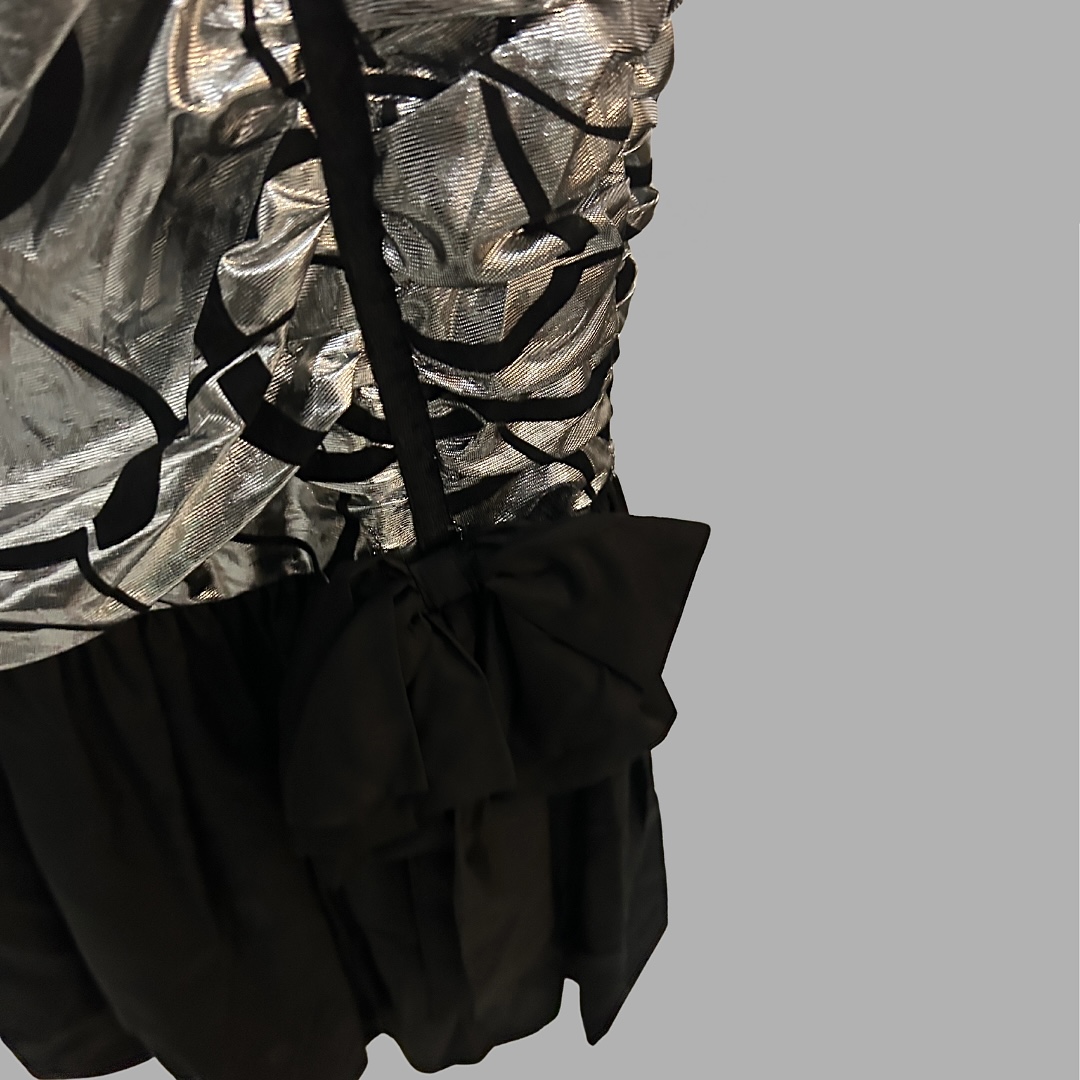 שמלת וינטג׳ 80’s כסופה מידה 36 עם שחור ושרוולים תפוחים עם כריות כתפיים ומחשוף לב ופפיון גדול בצד