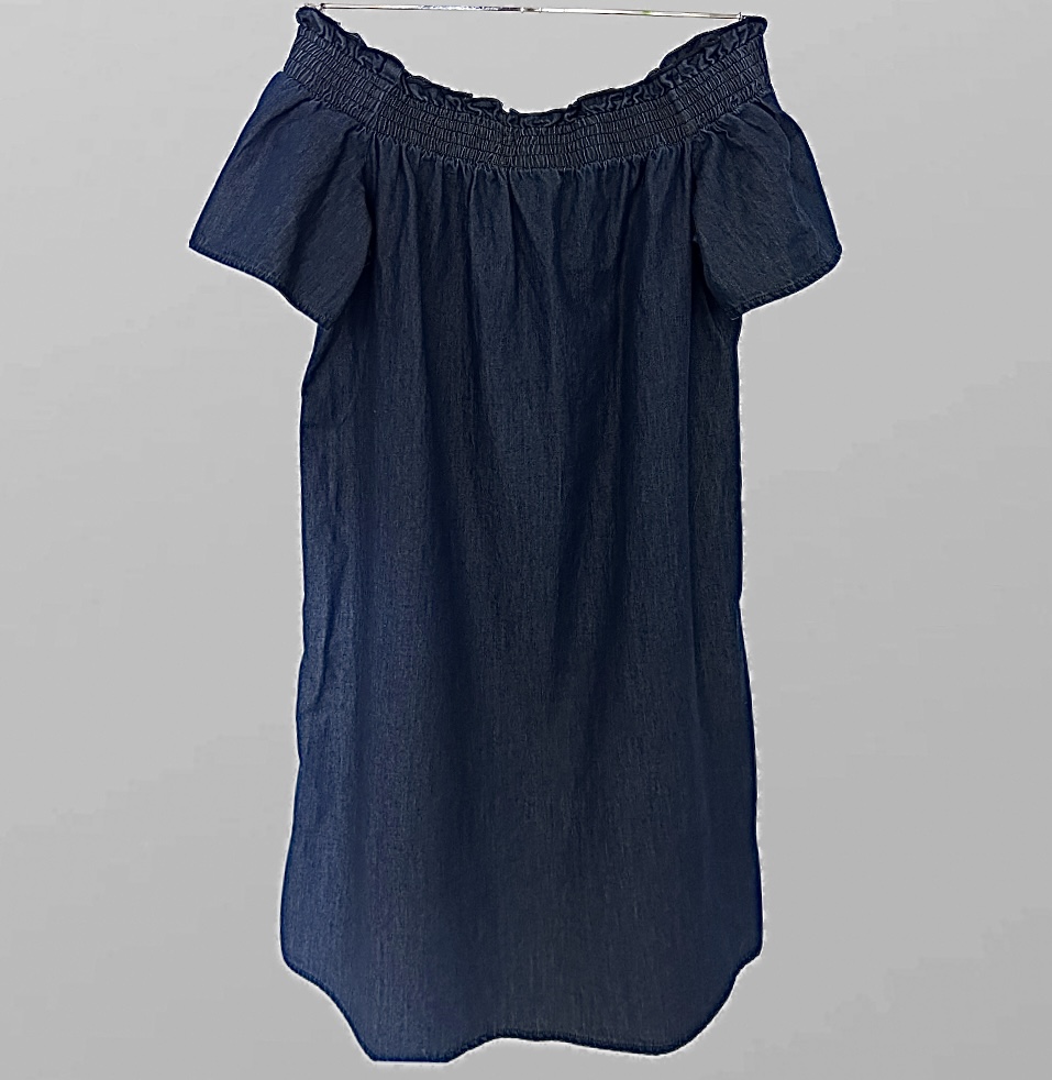שמלת מיני ג׳ינס משוחררת עם כתפיים חשופות עם גומי מידה