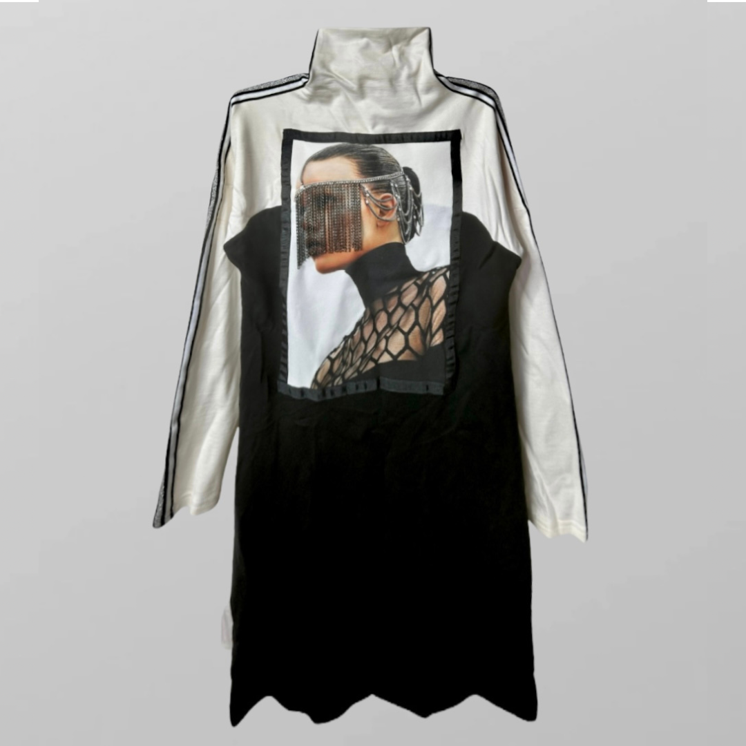 אורך – 85 ס״מ, היקף מותן 80-100 ס״מ, ויסקוזה שמלה שחורה עם שרוולים לבנים עם פסים מנצנצים מבד ג׳רסי איכותי, שמלה ספורט אלגנט נוחה עם הדפס מיוחד בפרונט וצווארון גבוה. המתאימה לכל בילוי, ליומיום או למשרד! שמלת מיני שחורה מיוחדת ומחטבת בשילוב פסים כסף בצידי השרוולים וגם בצווארון! נ רוכסן מאחורה! שמלה מושלמת למי שמחפשת אלגנטיות ונוחות! מידה 38 במצב חדש