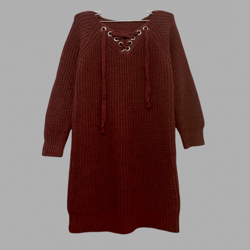שמלת מיני סריג בורדו/חמרה גזרה ישרה תערובת צמר מחממת עם שרוכים בחלק העליון מידה S