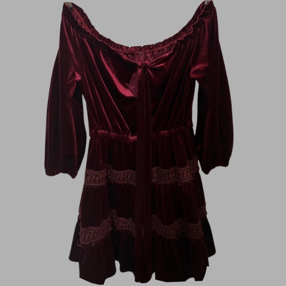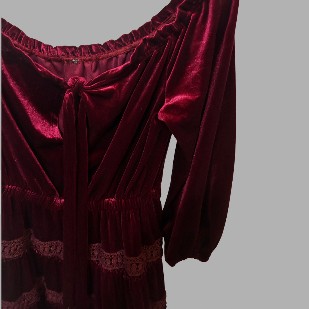 שמלת קטיפה בורדו גזרת A מידה S אוף שולדרס בשילוב תחרה וגומי במותן. מצב חדש