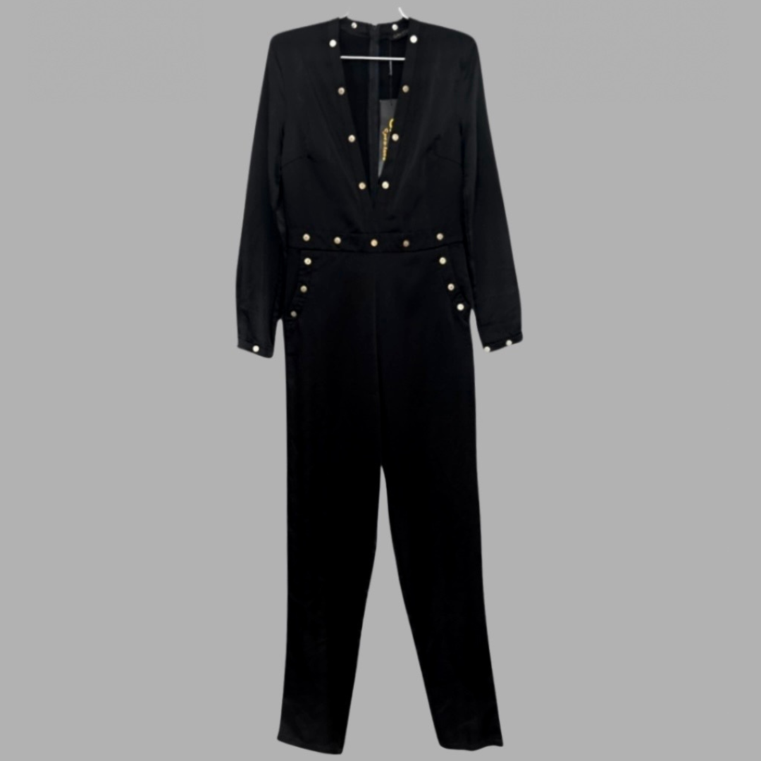 אוברול ערב שחור מסאטן עם מחשוף וי עמוק ועיטור ניטים יוקרתי