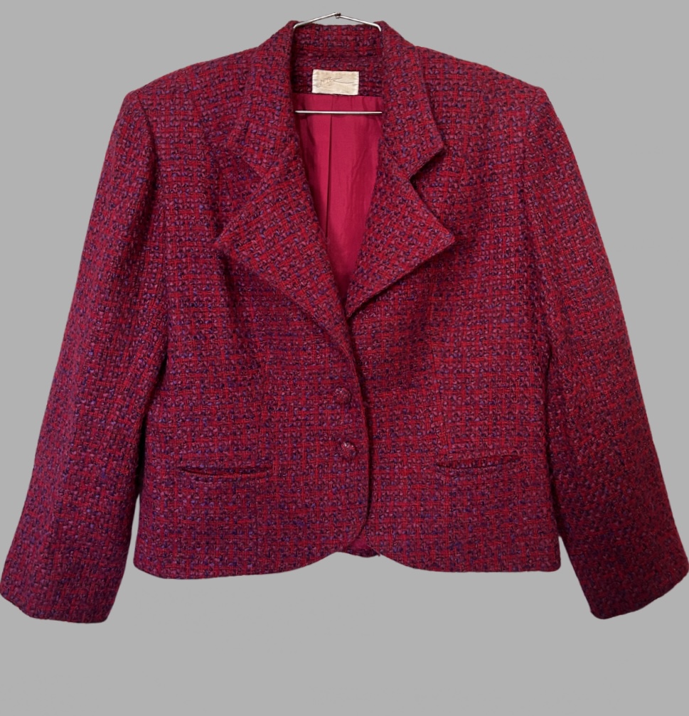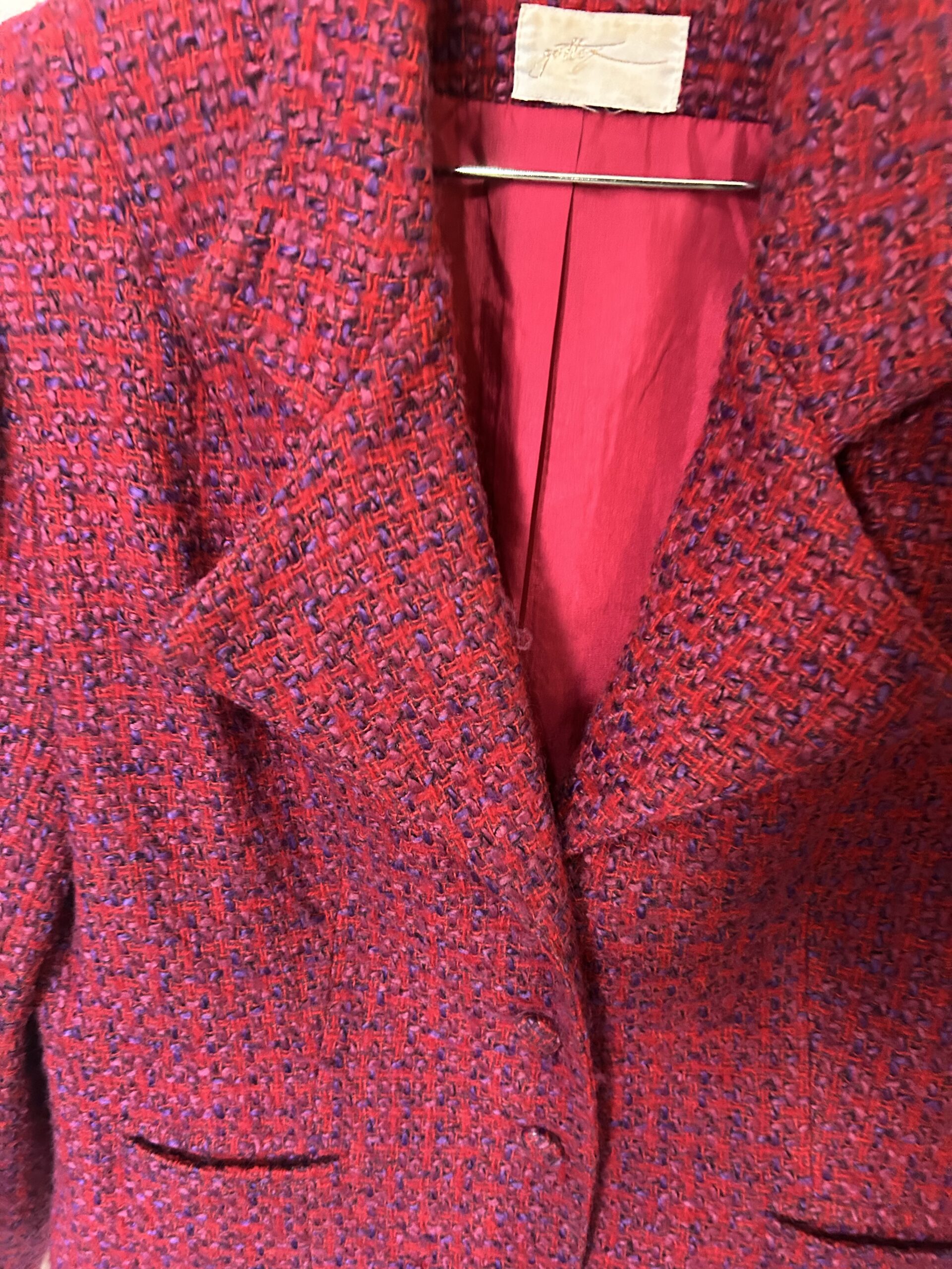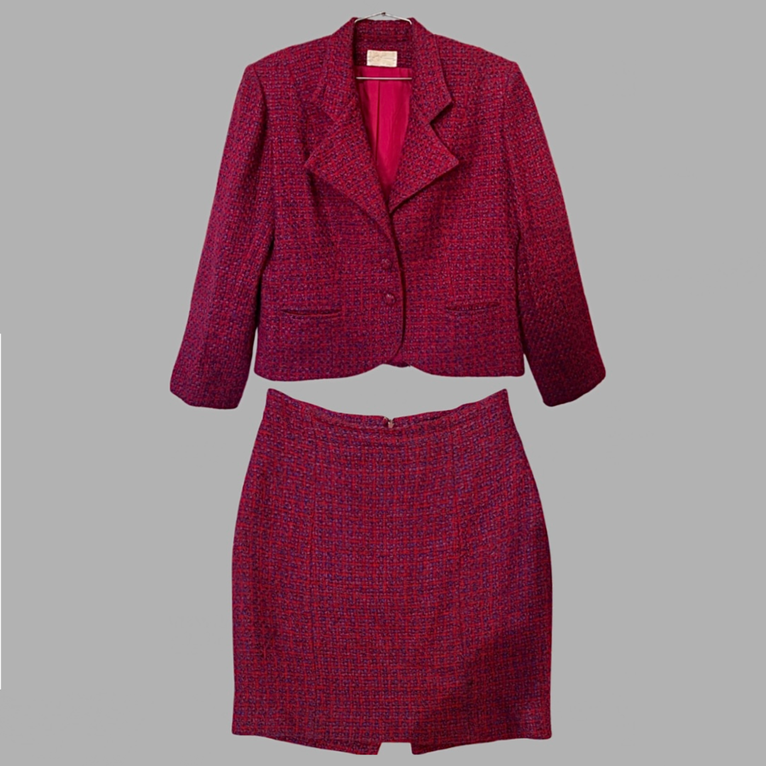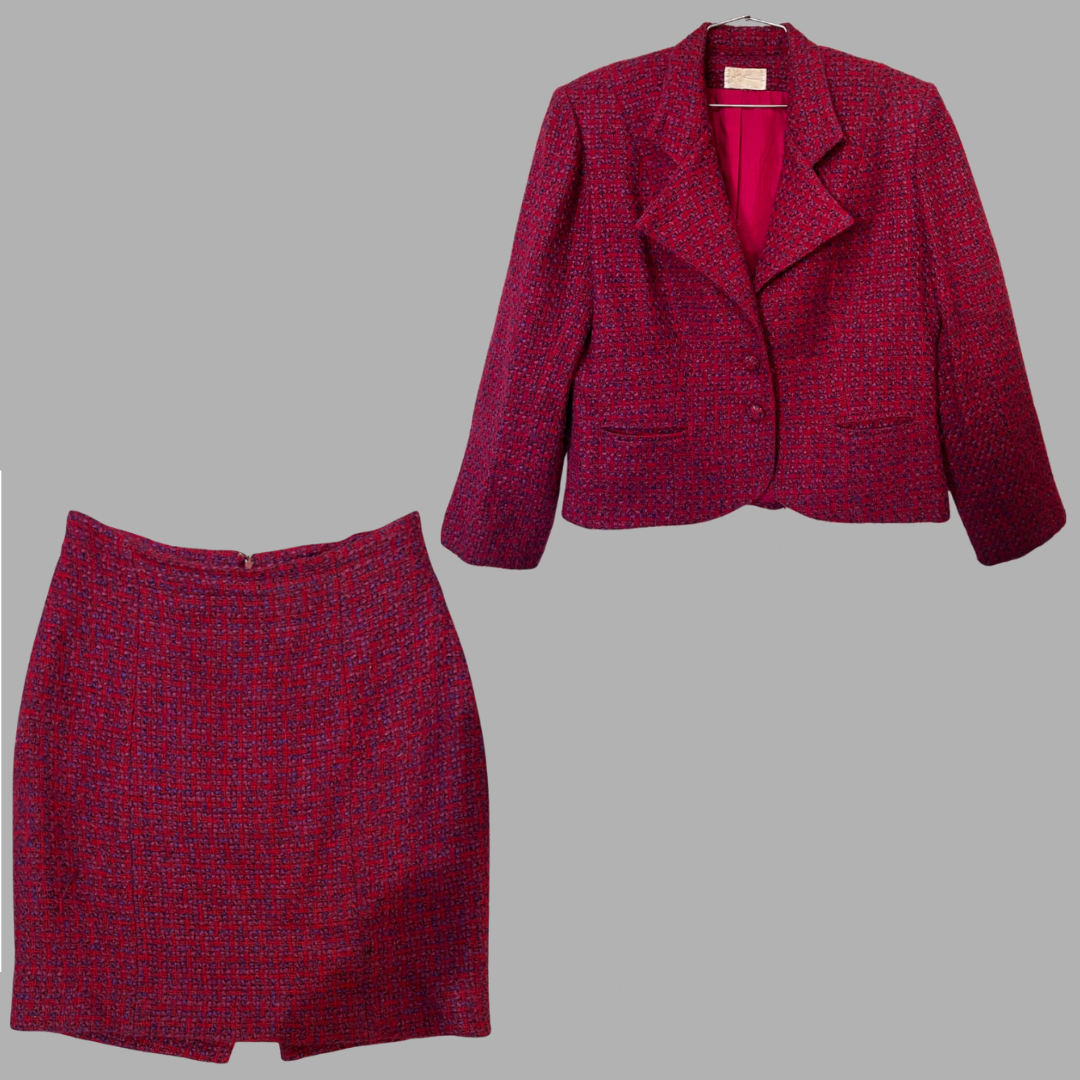 GOTEX וינטג׳ צמר חליפת חצאית ובלייזר סגולה מחויטת מידה S בטקסטורת שתי וערב השני צבעים .מצב מצויין