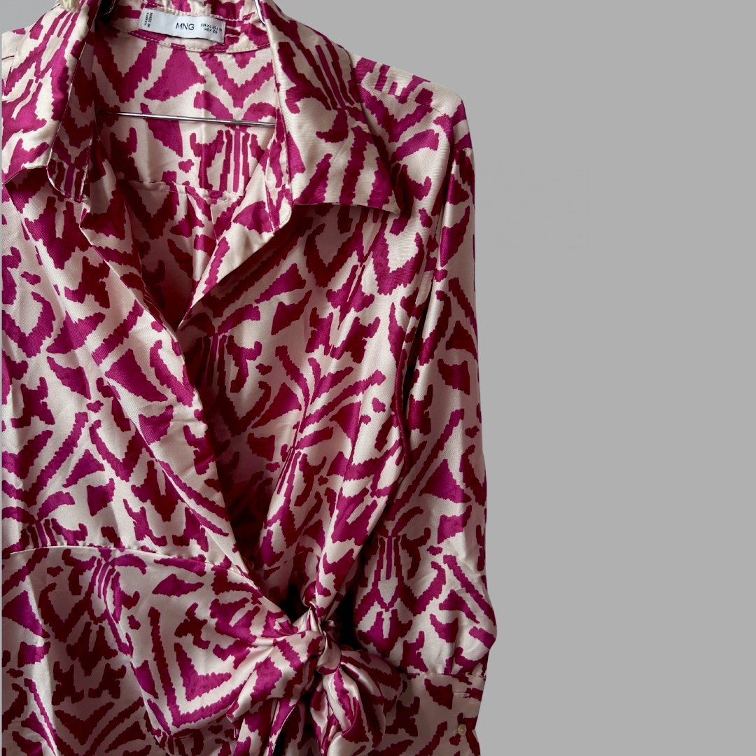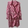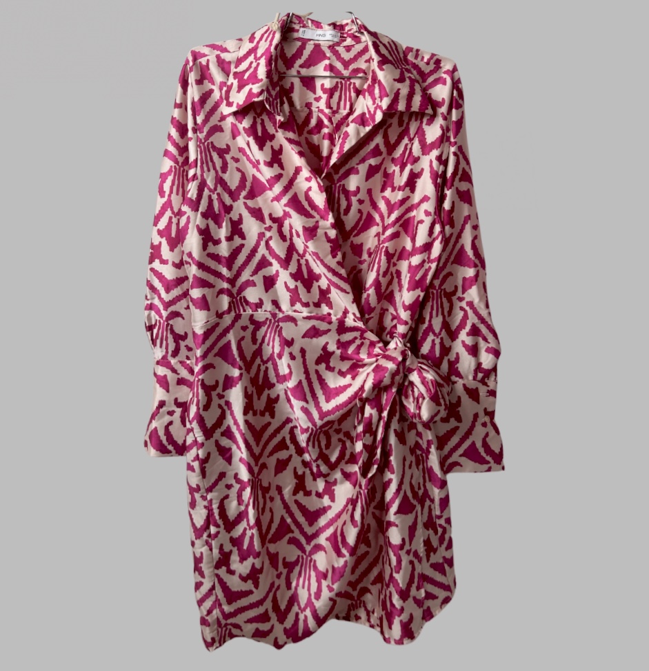 Mango מידה XL שמלת סאטן מעטפת עם קשירה בצד בהדפס ורוד לבן