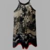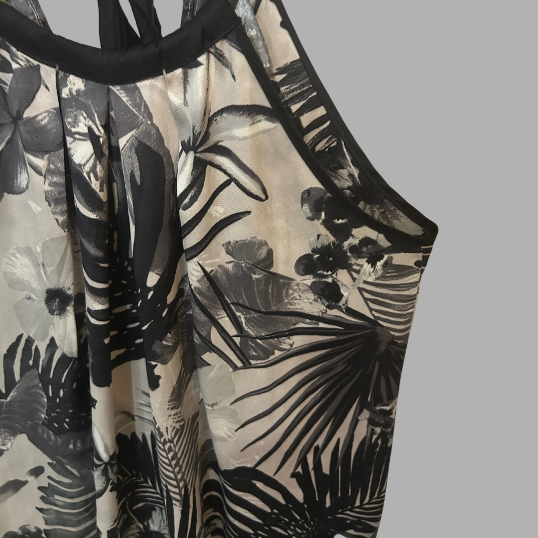 Mikaela מידה 38 שמלת סאטן מעוצבת נשפכת בצבע אפור ושחור עם הדפס עלים ופס אדום בסיומת, מצב חדש