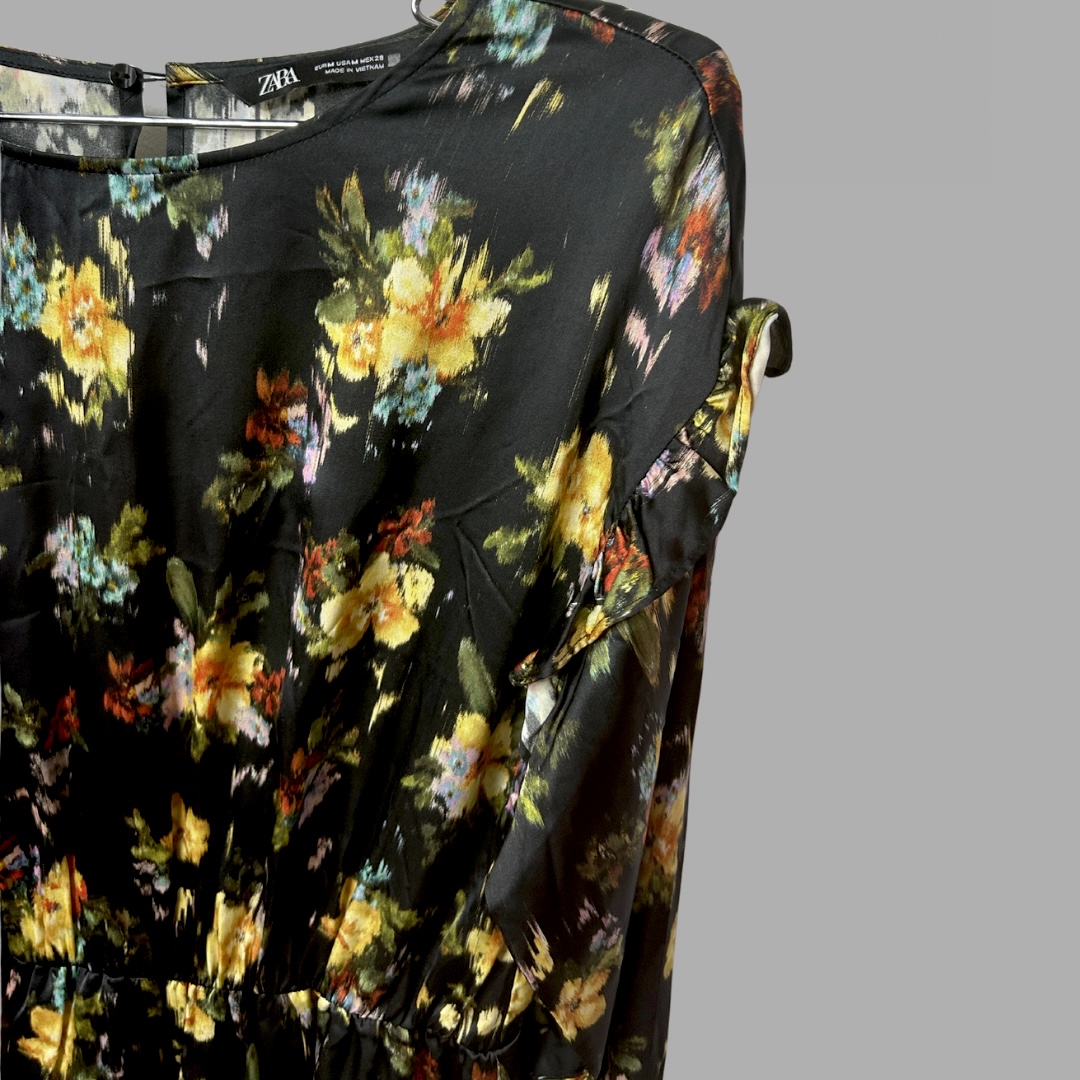 שמלה פרחונית אלגנטית מבית ZARA היא אחד מאותם פריטים שקשה להתעלם מהם – שמלה שכולה נשיות, רכות וסטייל. השמלה עשויה מבד סאטן איכותי עם גימור מבריק עדין שמעניק לה מראה יוקרתי ומוקפד. ההדפס הפרחוני העדין בגווני צהוב, כתום וירוק על רקע שחור יוצר ניגודיות מושלמת בין רוך לאלגנטיות, מה שהופך אותה לשמלה פרחונית שמתאימה גם ליום וגם לערב.