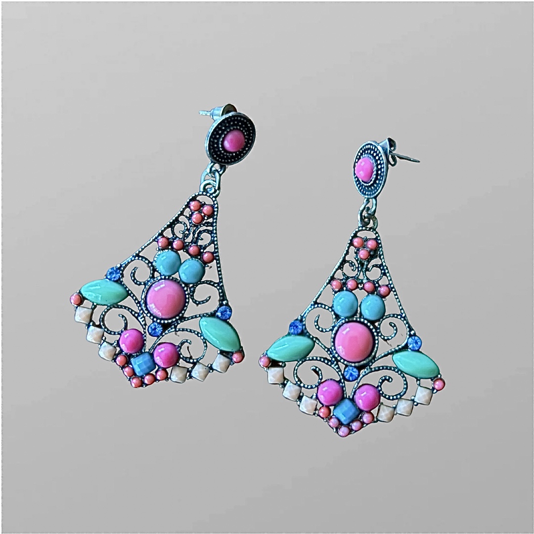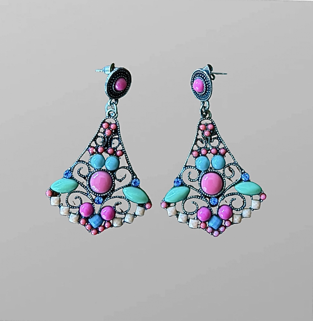 עגילי רטרו משובצות אבנים צבעוניות הכי אותנטיות ומיוחדות! במצב חדש! מידות – 6/3 סמ צבע טרקיז ורוד