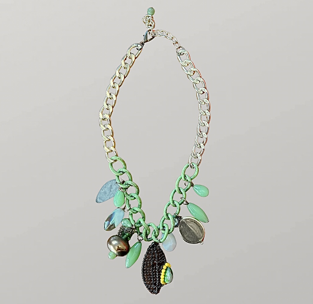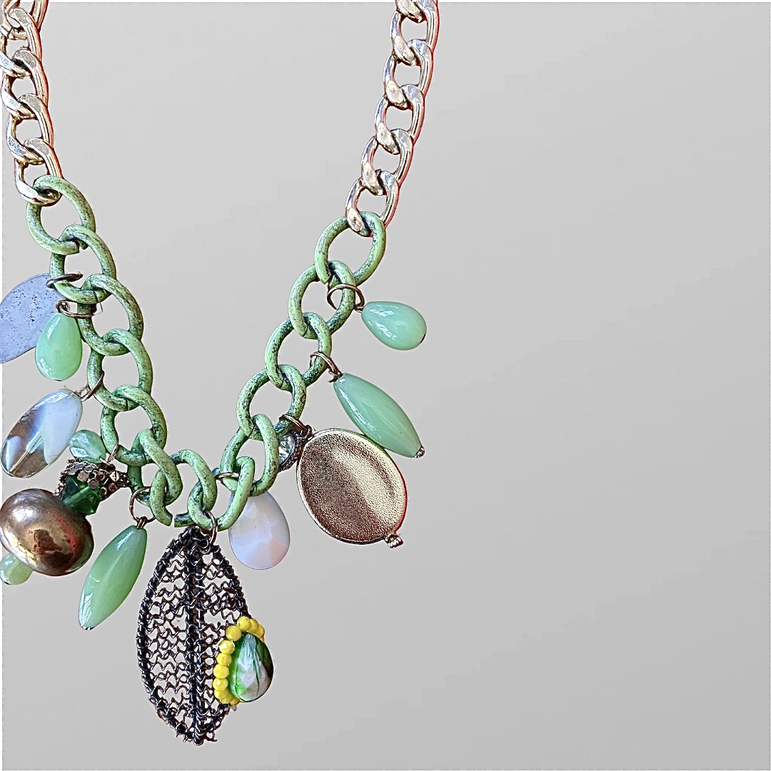 שרשרת מיוחדת של מעצבת עשויה בעבודת יד עם צ׳ארמים מיוחדים אורך סטנדרטי (לא צ׳וקר) שרשרת בשילו שרשרת לולאות חצי טורקיז חצי זהב