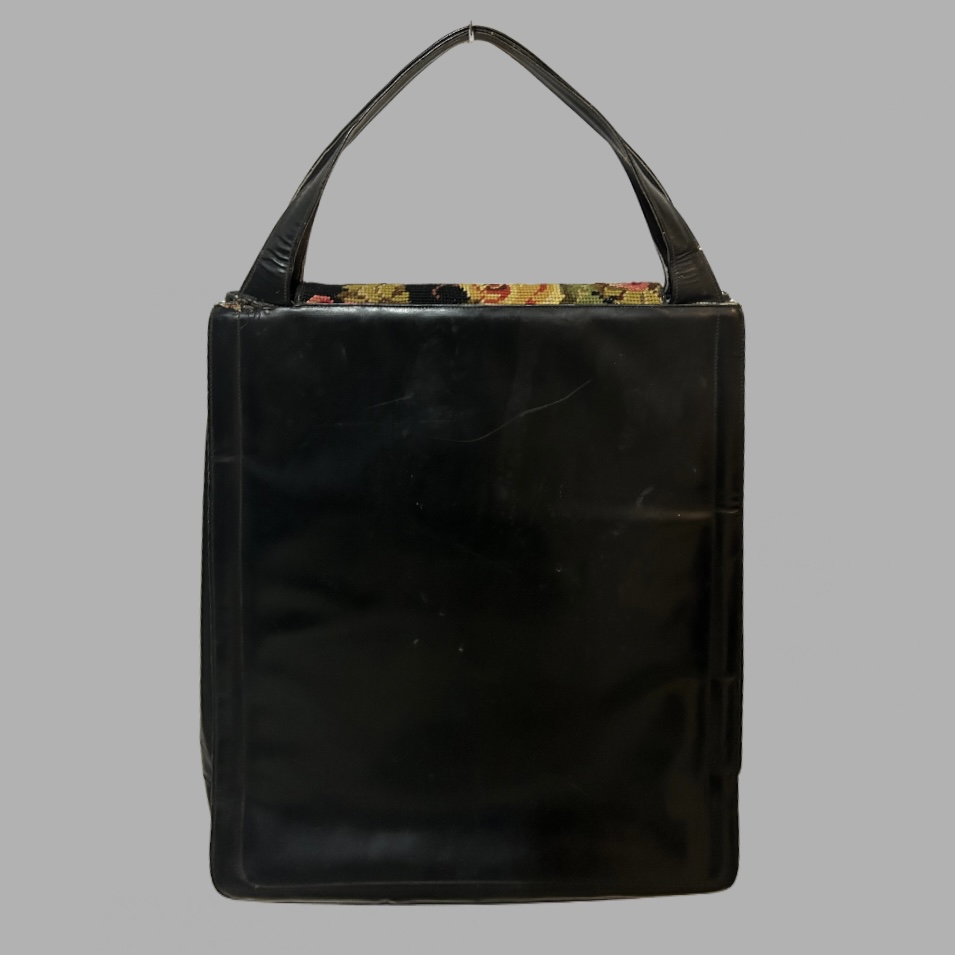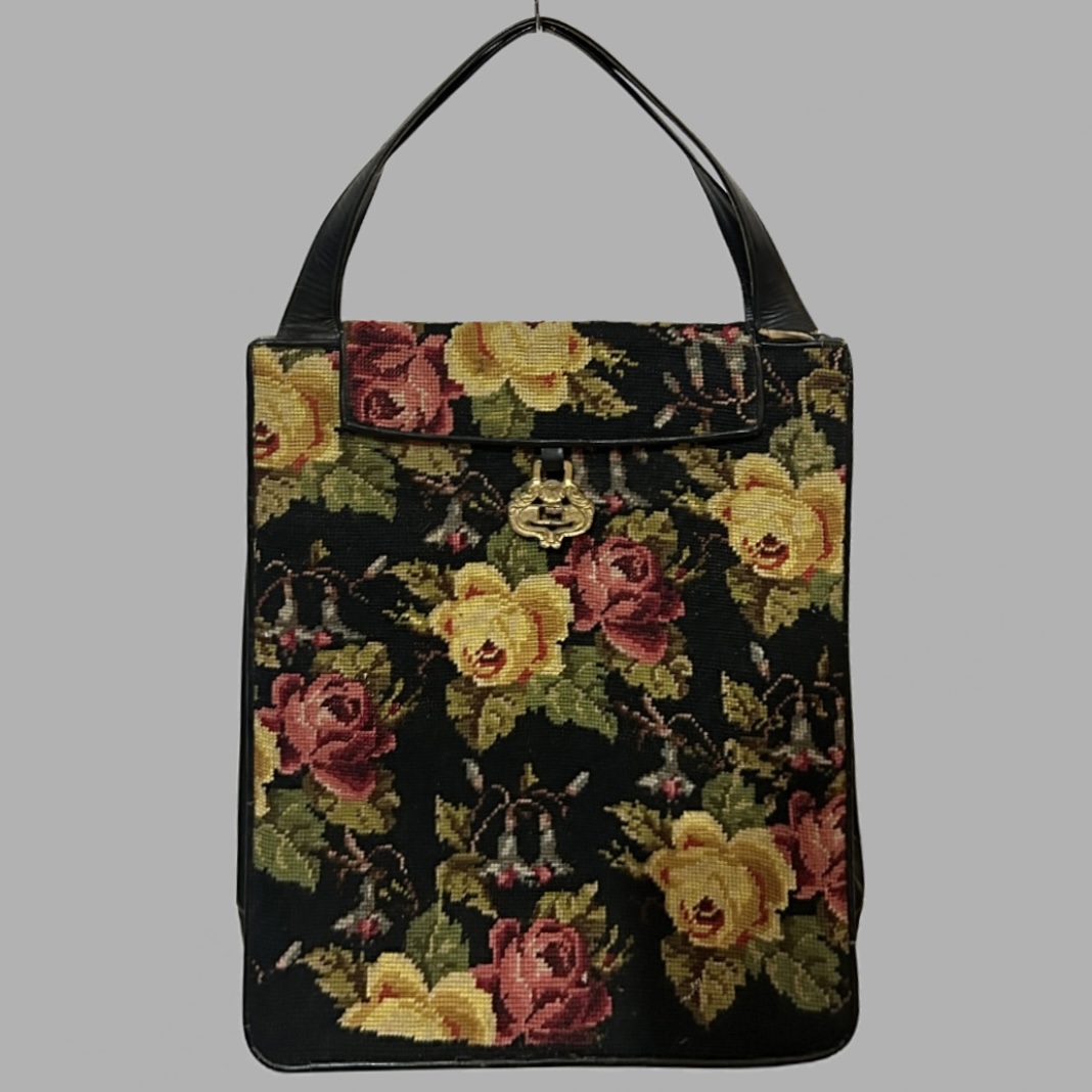 תיק וינטג’ רקום בעבודת גובלן (Needlepoint / Tapestry) עם פרינט פרחים קלאסי, משולב 100% עור שחור חלק, בסגנון אלגנטי־רומנטי של אמצע המאה. יש מעט סימני שימוש אך במצב מהמם