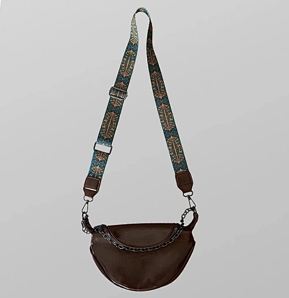 25/14 ס״מ תיק דמוי עור חום בגימור מעט מבריק בעיטור שרשרת עם רצועה עבה וארוכה.