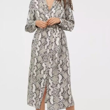 Hm מידה 44 שמלה אלגנטית מנוחשת מכופתרת מבד נשפך אוברסייז עם חגורה מקסי מנומרת שיפון מחשוף עמוק גומי במותן